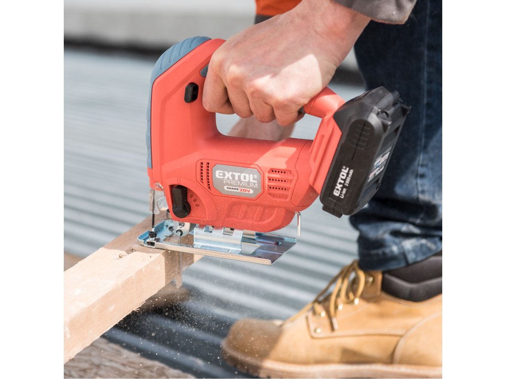 Aku přímočará pila SHARE20V je určena k provádění dělících a tvarových řezů, zejména do dřeva a dřevotřísky a k řezání kovů, plastu, keramických desek a gumy, dále sádrokartonu, cementotřískového materiálu. Díky rychloupínacímu systému lze pilový plátek „Bosch“ vyměnit bez použití nástrojů. Lze použít plátek jakéhokoliv výrobce s tímto úchytem. Standartně při řezání pila odfukuje piliny z místa řezání, ale pokud k ní připojíte vysavač, můžete tento odfuk přepnout a piliny přímo odsávat do vysavače, čímž dosáhnete mnohem čistějšího pracovního místa. Při řezání sádrokartónu a podobných materiálů s velmi jemným prachem je nutno vždy používat odsávání vysavačem. Při práci můžete regulovat rychlost kmitů pomocí spínače a také můžete nastavit sílu předkmitu. Obě nastavení se používají pro změnu stylu a rychlosti řezání v odlišných materiálech. Pro snadnější práci má pila LED světlo osvětlující pracovní místo, které se automaticky zapíná při stisku spínače. Gumová vrstva pokrývající pilu v místě úchopu snižuje množství vibrací, které se přenášejí do rukou a snižuje únavu při práci. Pro běžnou práci dostačují jeden nebo dva 2000mAh akumulátory, které můžete rychle nabít v rychlonabíječce, pro náročnější nebo delší práci doporučujeme větší akumulátory s kapacitou 4000–8000mAh. Akumulátor lze použít ve všech typech nářadí řady EXTOL SHARE20V. Díky použité Li-ion technologii je ho možné kdykoliv dobíjet, aniž by se tím snižovala jeho kapacita. Li-ion akumulátor ztrácí energii vlivem samovybíjení velmi pomalu a vydrží dlouho nabitý a připravený k použití.