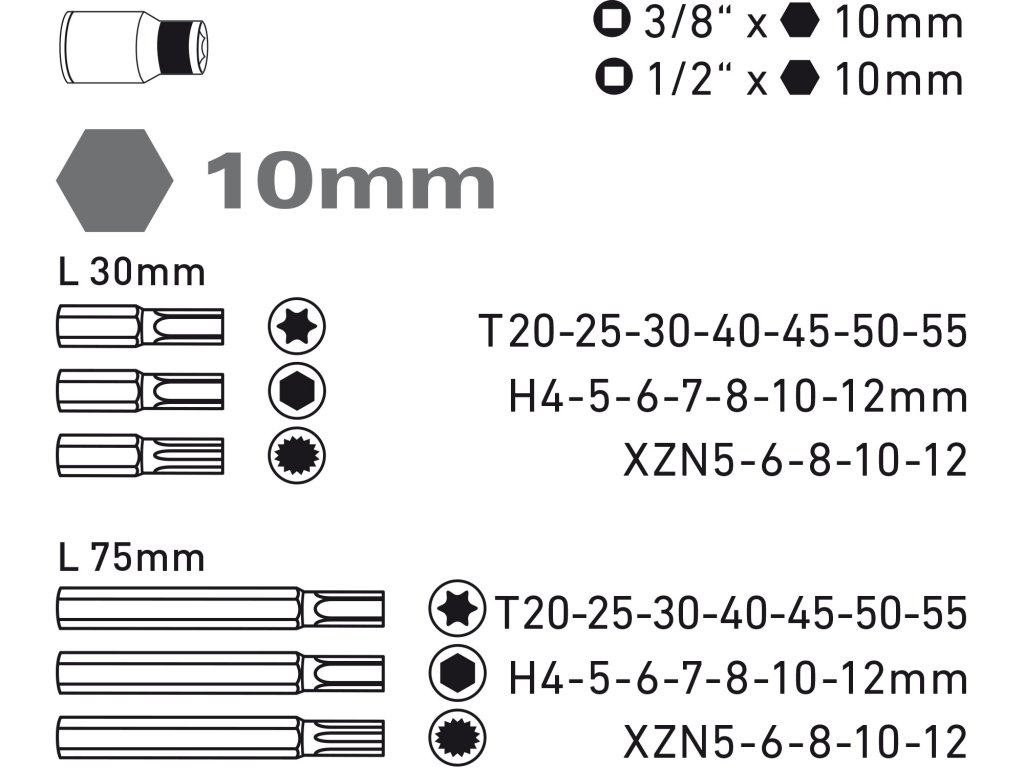 | hlavice zástrčné prodloužené | hroty zástrčné prodloužené 10mm(L75mm):T20-25-30-40-45-50-55, H4-5-6-7-8-10-12mm, XZN5-6-8-10-12 |